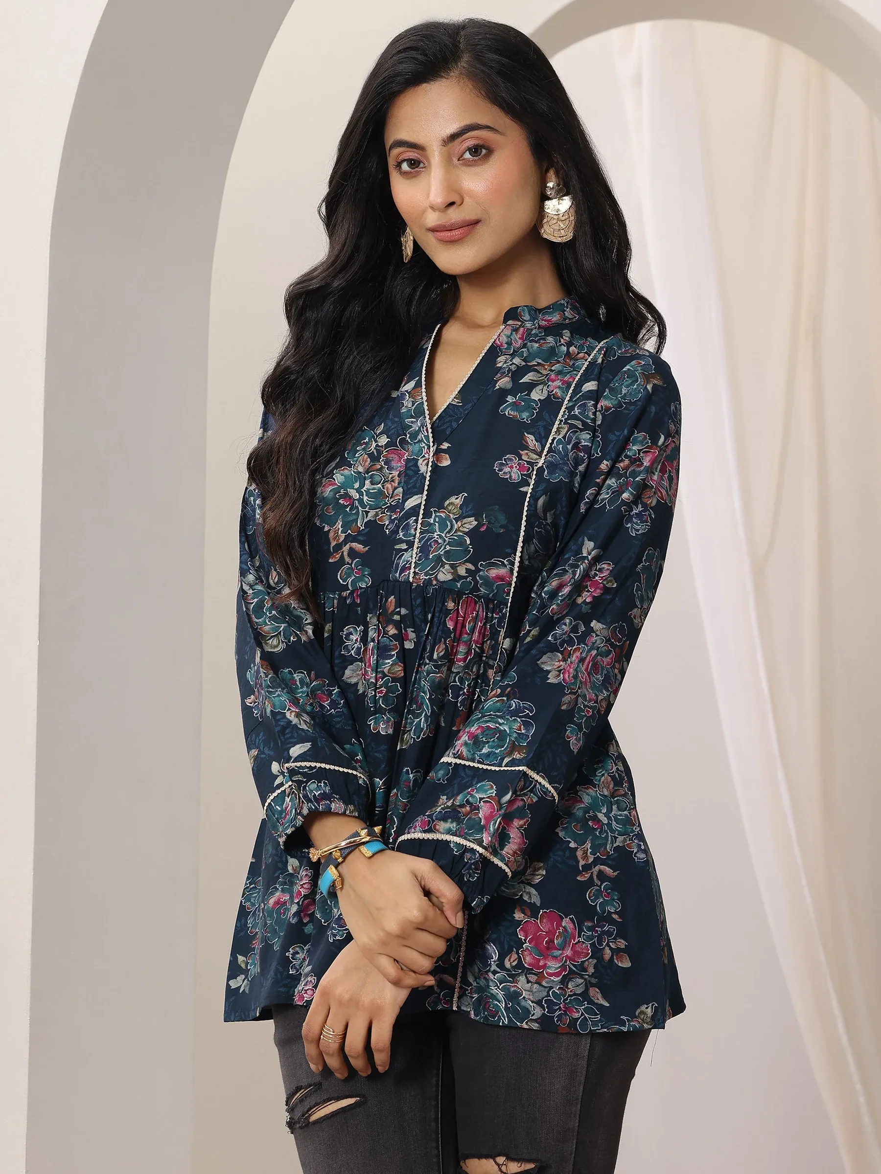 Blue Printed Silk Blend A-Line Short Kurti